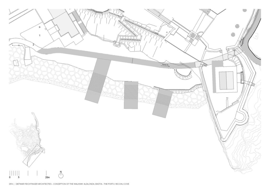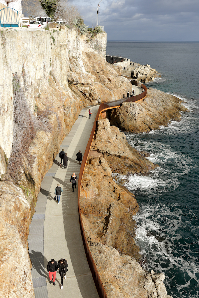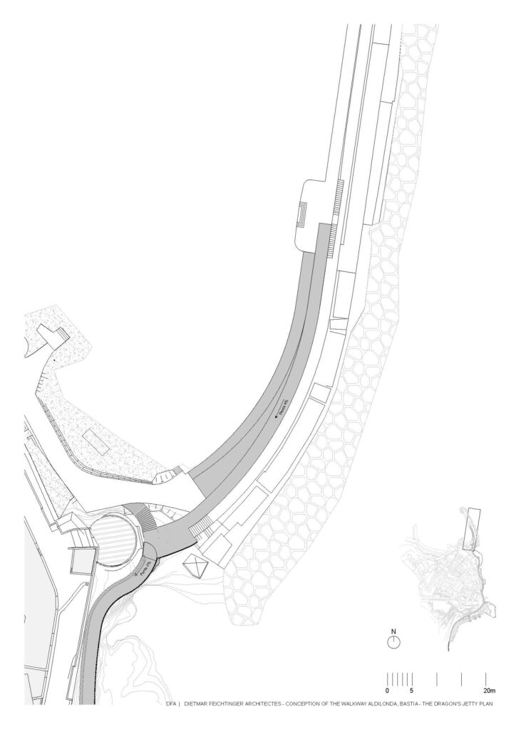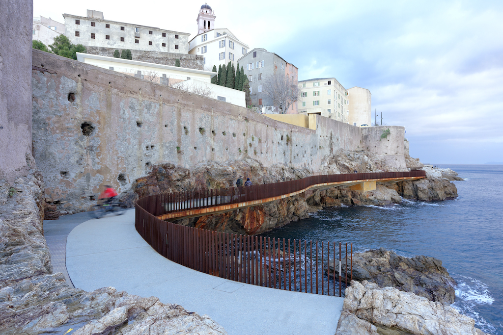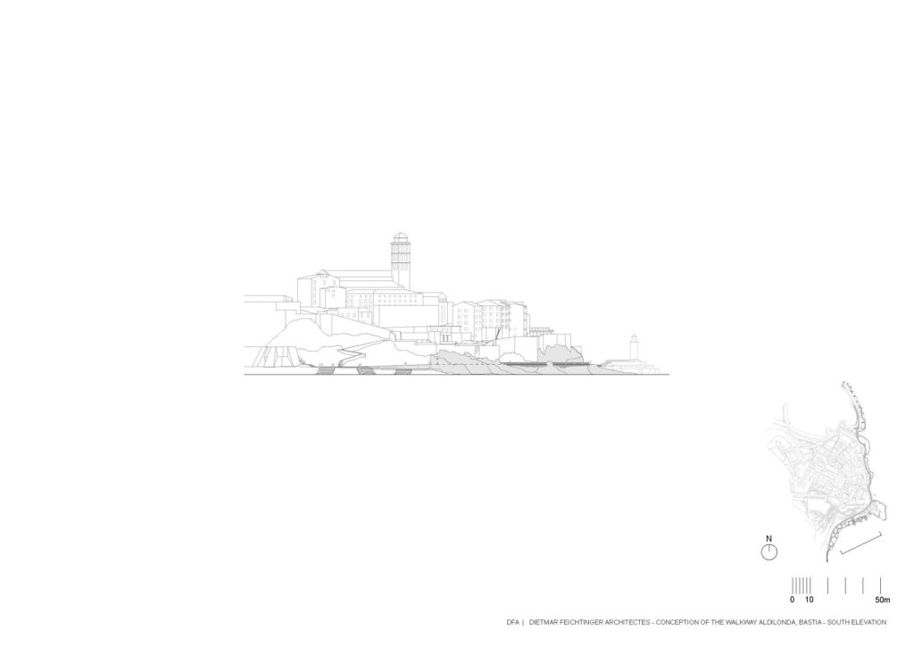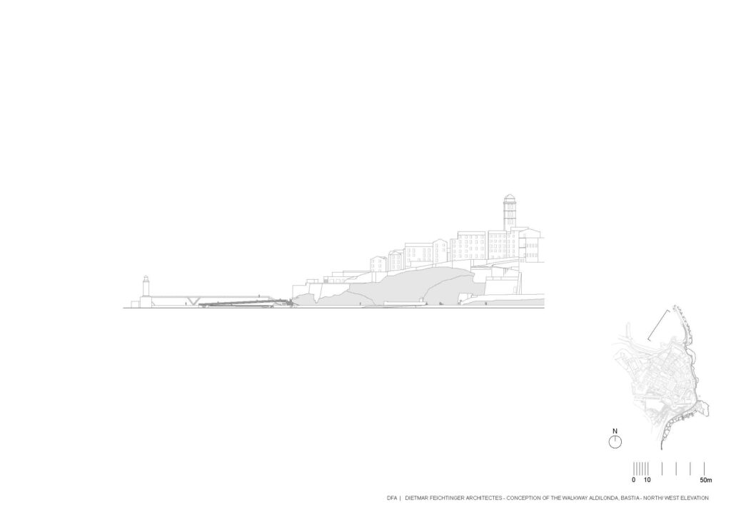 Em Bastia, na Córsega, França, a equipa de arquitectos da Dietmar Feichtinger liderou e coordenou, com um parceiro local, o arquitecto Buzzo Spinelli, a In Situ – paisagem e urbanismo – e SBP Bet, uma empresa de engenharia, a construção deste passeio marítimo, nomeado Aldilonda. A obra, encomendada pela câmara municipal de Bastia, e vencedora de concurso público, começou a ser planeada no final de 2017, tendo sido efectuadas análises a regulamentos e a regras relativas a impactos ambientais. Juntou-se ainda a avaliação de técnicas de construção na orla marítima bem como cálculos relacionados com as dinâmicas do mar, parcerias com duas firmas a GO VRD e a SAS Antoniotti + NGE Fondations.